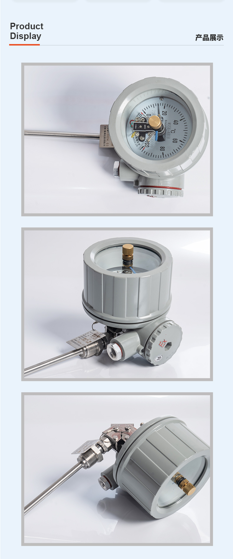 防爆電接點雙金屬溫度計WSSX-414,外殼采用鋁合金制成,通過鋁合金外殼把儀表內(nèi)可能產(chǎn)生火花、電弧的電路與表殼外爆炸性氣體混合物隔開,從而達到隔爆的目的。