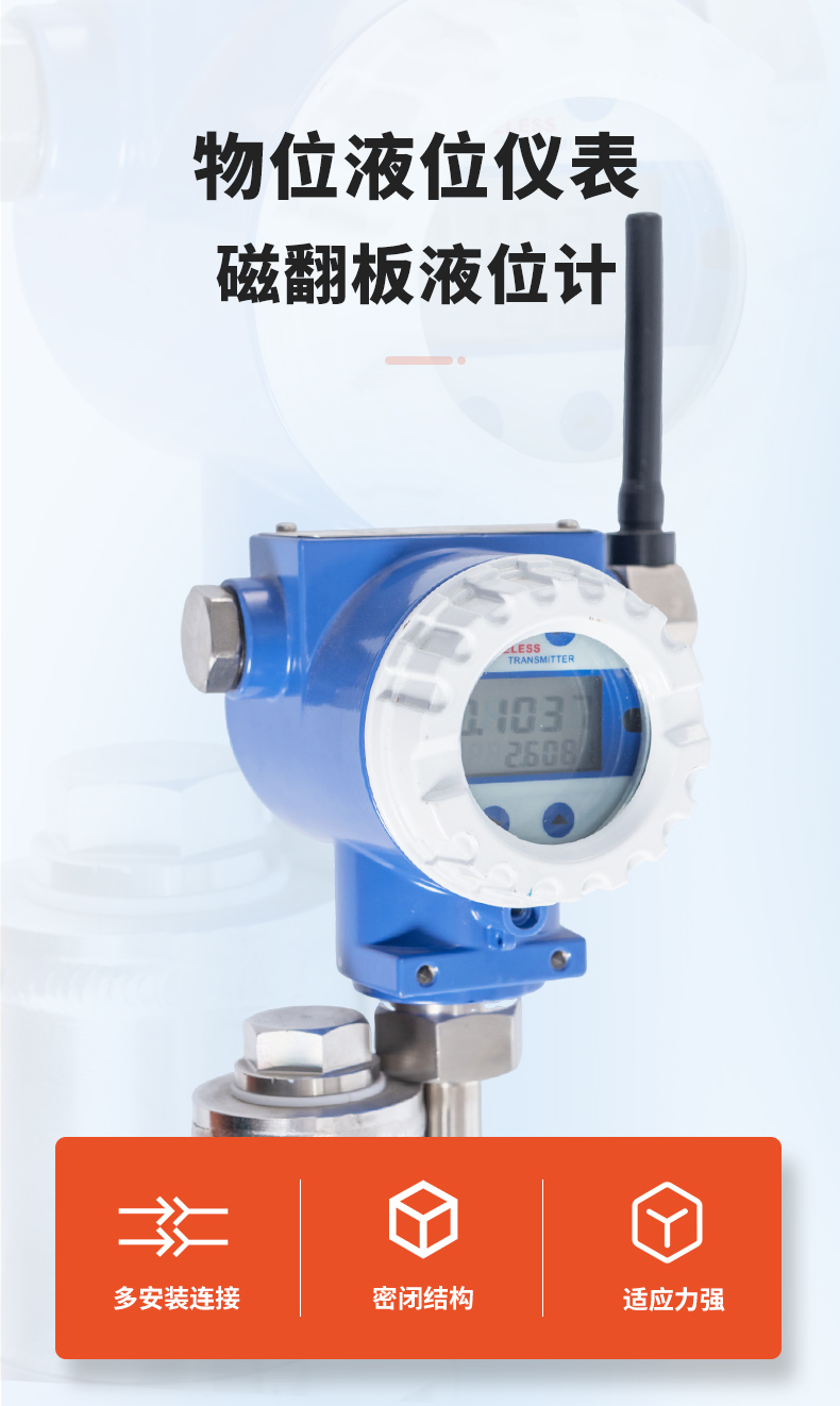 磁翻板液位計(jì)工作的基本原理: 磁翻板液位計(jì)根據(jù)浮力原理和磁性耦合作用原理工作的。當(dāng)被測(cè)容器中的液位升降時(shí),磁翻板液位計(jì)主導(dǎo)管中的浮子也隨之升降,浮子內(nèi)的長(zhǎng)久磁鋼通過(guò)磁耦合傳遞到現(xiàn)場(chǎng)指示器,驅(qū)動(dòng)紅、白翻柱翻轉(zhuǎn)180°,當(dāng)液位上升時(shí),翻柱由白色轉(zhuǎn)為紅色,當(dāng)液位下降時(shí),翻柱由紅色轉(zhuǎn)為白色。磁翻板液位計(jì)根據(jù)浮力原理和磁性耦合作用原理工作的。當(dāng)被測(cè)容器中的液位升降時(shí),磁翻板液位計(jì)主導(dǎo)管中的浮子也隨之升降,浮子內(nèi)的長(zhǎng)久磁鋼通過(guò)磁耦合傳遞到現(xiàn)場(chǎng)指示器,驅(qū)動(dòng)紅、白翻柱翻轉(zhuǎn)180°,當(dāng)液位上升時(shí),翻柱由白色轉(zhuǎn)為紅色,當(dāng)液位下降時(shí),翻柱由紅色轉(zhuǎn)為白色,指示器的紅、白界位處為容器內(nèi)介質(zhì)液位的實(shí)際高度,從而實(shí)現(xiàn)液位的指示。也可在本體管上加裝磁性技術(shù),開(kāi)關(guān)或遠(yuǎn)傳變送器,輸出開(kāi)關(guān)信號(hào)或模擬量信號(hào)。適合用于高溫、高壓、耐腐蝕等場(chǎng)合,可就地顯示和遠(yuǎn)程控制。