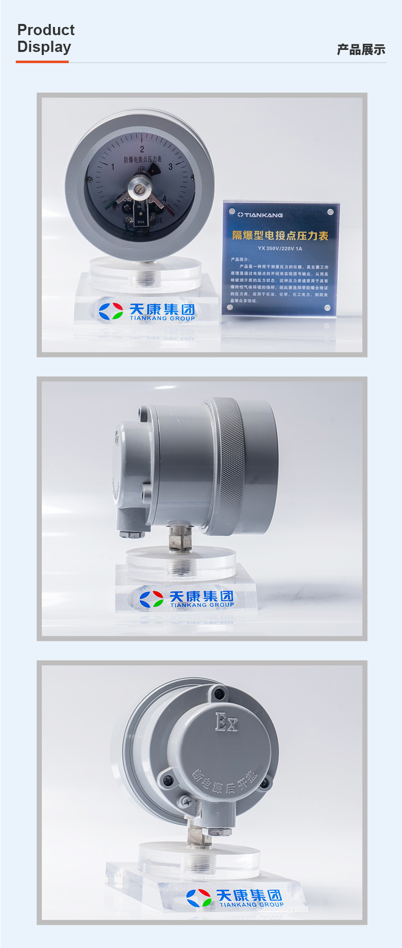 YX-160-B防爆電接點(diǎn)壓力表由隔爆外殼、測(cè)量系統(tǒng)、電接點(diǎn)組、調(diào)節(jié)裝置和出線盒等組成。該壓力表的隔爆外殼具有良好的隔爆性能,因此防爆電接點(diǎn)壓力表對(duì)在正常工作過程中由于火花或電弧的影響,除了能承受殼體內(nèi)部的爆炸性氣體混合物在一旦引起爆炸時(shí)產(chǎn)生的爆炸壓力外,并能有效地阻止由此產(chǎn)生的熱能向外順利傳播,而只能在殼體內(nèi)部沿著隔爆接合面的微小縫隙處緩慢地向外擴(kuò)散。這時(shí),傳至殼體外部的瞬間溫度已降低到爆炸性氣體混合物的燃點(diǎn)溫度以下,故不會(huì)導(dǎo)致傳爆。