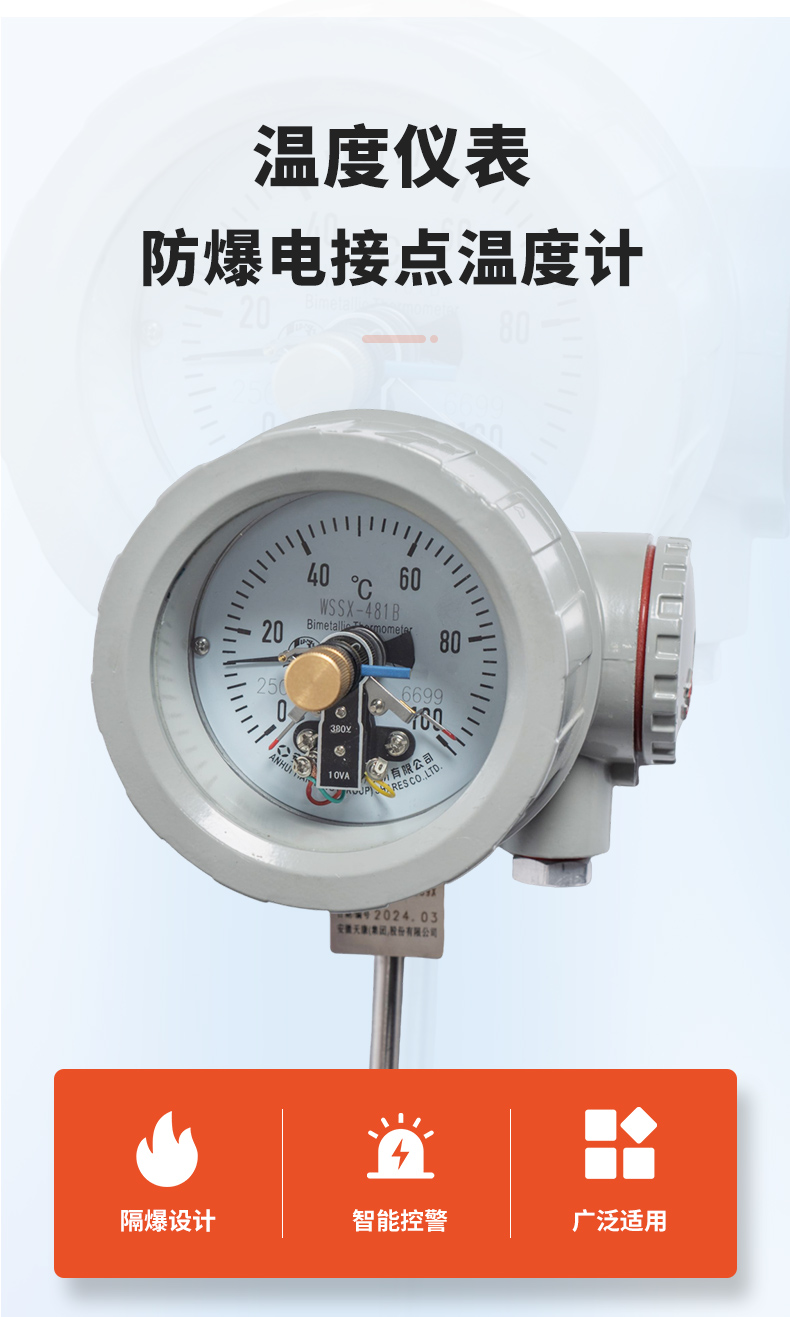 防爆電接點雙金屬溫度計WSSX-414,外殼采用鋁合金制成,通過鋁合金外殼把儀表內(nèi)可能產(chǎn)生火花、電弧的電路與表殼外爆炸性氣體混合物隔開,從而達到隔爆的目的。
