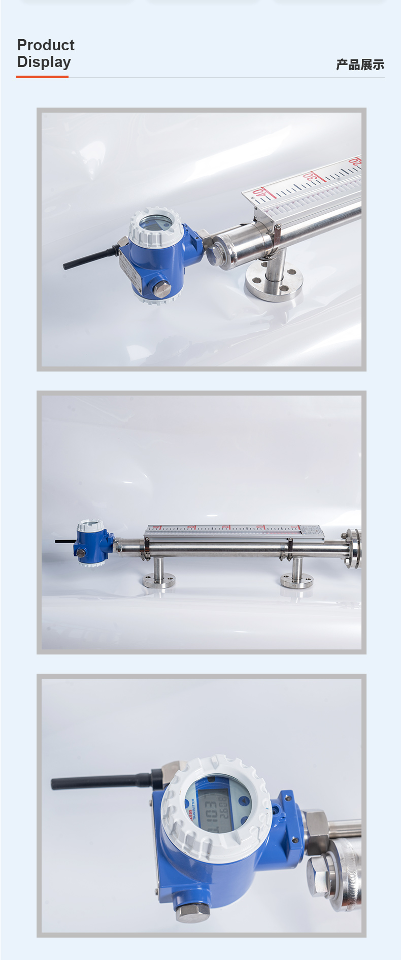 磁翻板液位計(jì)工作的基本原理: 磁翻板液位計(jì)根據(jù)浮力原理和磁性耦合作用原理工作的。當(dāng)被測(cè)容器中的液位升降時(shí),磁翻板液位計(jì)主導(dǎo)管中的浮子也隨之升降,浮子內(nèi)的長(zhǎng)久磁鋼通過(guò)磁耦合傳遞到現(xiàn)場(chǎng)指示器,驅(qū)動(dòng)紅、白翻柱翻轉(zhuǎn)180°,當(dāng)液位上升時(shí),翻柱由白色轉(zhuǎn)為紅色,當(dāng)液位下降時(shí),翻柱由紅色轉(zhuǎn)為白色。磁翻板液位計(jì)根據(jù)浮力原理和磁性耦合作用原理工作的。當(dāng)被測(cè)容器中的液位升降時(shí),磁翻板液位計(jì)主導(dǎo)管中的浮子也隨之升降,浮子內(nèi)的長(zhǎng)久磁鋼通過(guò)磁耦合傳遞到現(xiàn)場(chǎng)指示器,驅(qū)動(dòng)紅、白翻柱翻轉(zhuǎn)180°,當(dāng)液位上升時(shí),翻柱由白色轉(zhuǎn)為紅色,當(dāng)液位下降時(shí),翻柱由紅色轉(zhuǎn)為白色,指示器的紅、白界位處為容器內(nèi)介質(zhì)液位的實(shí)際高度,從而實(shí)現(xiàn)液位的指示。也可在本體管上加裝磁性技術(shù),開(kāi)關(guān)或遠(yuǎn)傳變送器,輸出開(kāi)關(guān)信號(hào)或模擬量信號(hào)。適合用于高溫、高壓、耐腐蝕等場(chǎng)合,可就地顯示和遠(yuǎn)程控制。