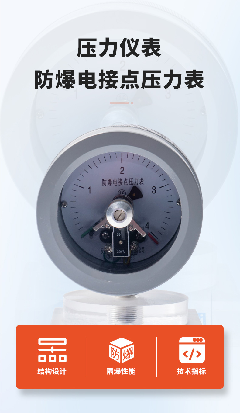 YX-160-B防爆電接點(diǎn)壓力表由隔爆外殼、測(cè)量系統(tǒng)、電接點(diǎn)組、調(diào)節(jié)裝置和出線盒等組成。該壓力表的隔爆外殼具有良好的隔爆性能,因此防爆電接點(diǎn)壓力表對(duì)在正常工作過程中由于火花或電弧的影響,除了能承受殼體內(nèi)部的爆炸性氣體混合物在一旦引起爆炸時(shí)產(chǎn)生的爆炸壓力外,并能有效地阻止由此產(chǎn)生的熱能向外順利傳播,而只能在殼體內(nèi)部沿著隔爆接合面的微小縫隙處緩慢地向外擴(kuò)散。這時(shí),傳至殼體外部的瞬間溫度已降低到爆炸性氣體混合物的燃點(diǎn)溫度以下,故不會(huì)導(dǎo)致傳爆。